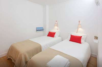 O apartamento está cheio de luz e tem uma cama de casal e duas camas de solteiro, perfeito para quatro pessoas. Nas minhas viagens olho à limpeza e localização, nem sempre o bom gosto impera nas casas, mas neste caso não têm com que se preocupar, os olhos agradecem a decoração clean, minimalista e com uma combinação de cores perfeita. O cuidado é tal que até os lençóis são escolhidos a dedo, de algodão a sério, tal como a minha tia gosta de ter em casa para uso pessoal. Ela é considerada pelo AirBnb uma "super host", tem uma medalha junto à foto atribuída pelo AirBnb. Isto é como receber uma condecoração de guerra!