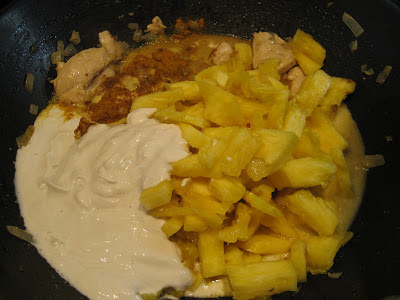 5. Acrescentar abacaxi em quantidade a gosto, o leite de coco, o caril e um golpe de leite magro.